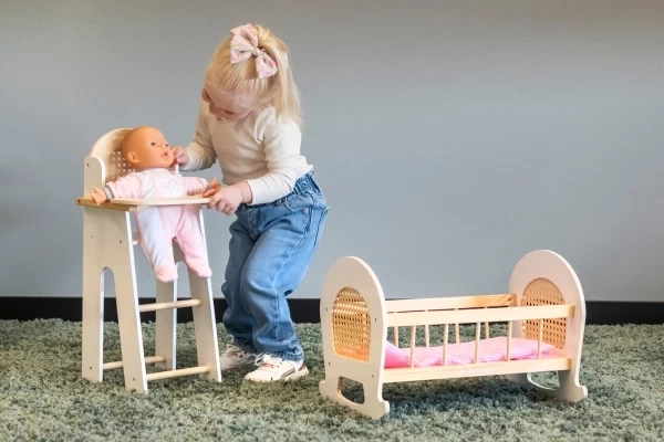 Ontdek deze prachtige houten poppenstoel en -wieg in één complete set. Perfect voor kleine poppenouders vanaf 3 jaar! Geschikt voor poppen tot 42 cm en ideaal voor urenlang fantasierijk speelplezier. Laat de pop gezellig plaatsnemen in het comfortabele stoeltje (27x24x56,5 cm), voorzien van een handig opklapbaar plateau. Perfect voor het voeden of samen spelen! Na een drukke speeldag kan de pop heerlijk rusten in de bijpassende wieg (46x33x33 cm). De wieg wordt geleverd met schattig roze geruit beddengoed. Deze leuke houten met rotan poppenset is een stijlvolle en praktische toevoeging aan elke poppenhoek!