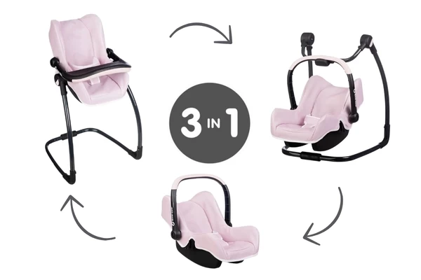 Met deze beige Maxi Cosi-set van Smoby kan jouw pop in drie verschillende soorten stoeltjes zitten! Ten eerste is de Maxi-Cosi los te gebruiken. Deze kan vervolgens als schommelstoel in het frame worden gehangen. Als derde kan het frame om worden gebouwd naar een hoge eetstoel. Deze 3in1 set is geschikt voor poppen tot 42 cm en kinderen vanaf 3 jaar.